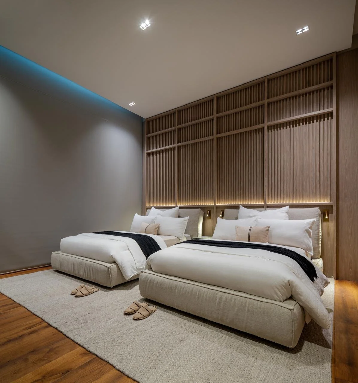 Interior view of a modern room with wooden slat walls, hardwood flooring, and a wooden and glass partition with geometric design.
